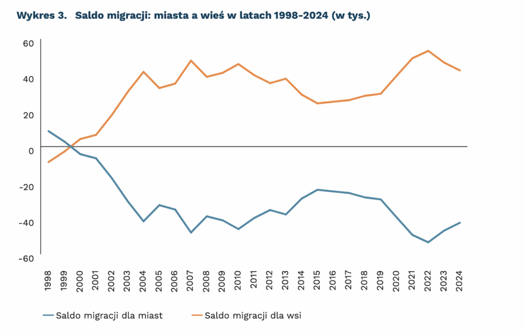 Według Polskiego Instytutu Ekonomicznego, najnowsze dane GUS dotyczące migracji wewnętrznych (na pobyt stały) w Polsce potwierdzają, że od prawie 25 lat mamy do czynienia ze zjawiskiem suburbanizacji – następuje systematyczny odpływ ludności z miast do gmin ościennych, co skutkuje ujemnym saldem migracji wewnętrznych dla wielu miast.