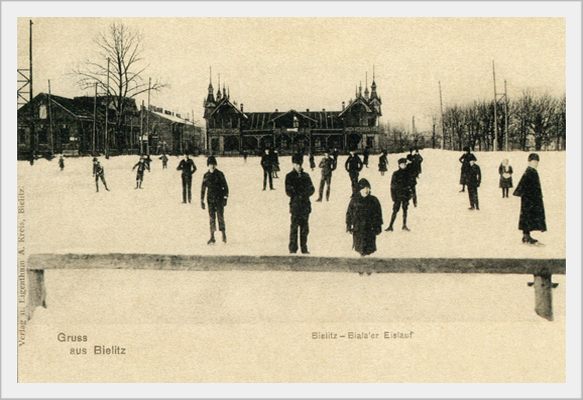 Już w dwie dekady po założeniu londyńskiego Glaciarium, w 1895 roku w południowej części terenów zielonych miasta Bielsko (przy ówczesnej ulicy Blichowej 59) wzniesiono Pawilon Lodowy, towarzyszący zimowemu lodowisku utworzonemu na zalewanej wodą płycie placu ćwiczebnego lokalnej Straży Pożarnej. Drewniany budynek wybudowano z inicjatywy Bielsko-Bialskiego Towarzystwa Łyżwiarskiego (Bielitz-Bialaer Eislaufverein), a koszty pokryto ze środków miejskich. Otwarcie lodowiska odbyło się w styczniu 1886 roku. W pawilonie znajdowała się szatnia, wypożyczalnia i restauracja. Lodowisko cieszyło się popularnością, a obiekt rozbudowywano i unowocześniano.